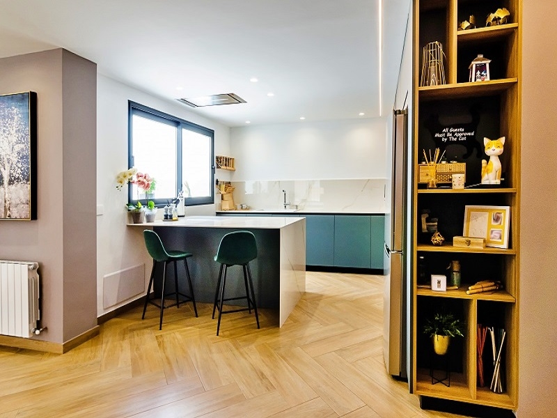 Puesto que la cocina iba a estar abierta al salón, colocando una península, se consiguió separar los distintos espacios, aprovechando esta para disponer de almacenaje por un lado y barra para comer por el otro.