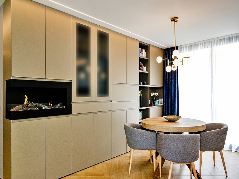 Vemos también el cuidado en la elección del mobiliario, hecho a medida y con detalles como la incorporación de una chimenea en esquina.